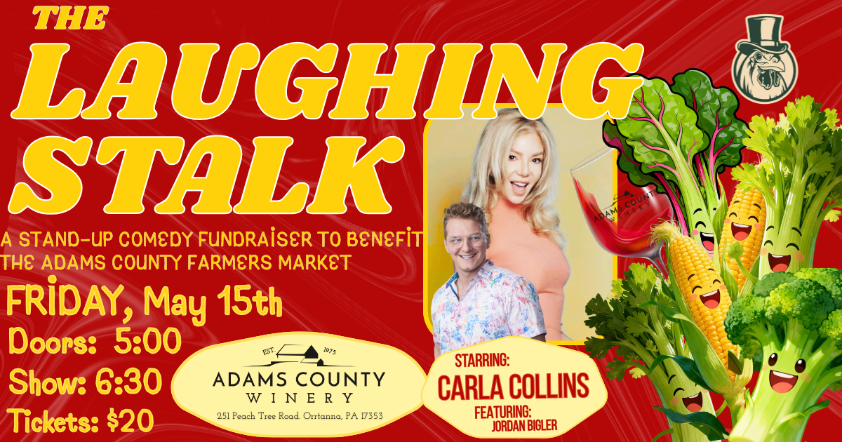 The Laughing Stalk is a one-of-a-kind stand-up comedy night fundraiser supporting the Adams County Farmers Market and our work to strengthen local agriculture and expand food access right here in Adams County. Join us in Orrtanna, PA, at the Adams County Winery for an evening of live stand-up comedy featuring acclaimed comedian and entertainer, Carla Collins!