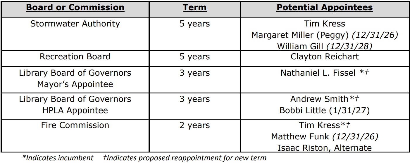 a. Accept the offer by Hanover Land Services, Inc., on behalf of Aiello’s Rentals, LLC to grant an extension for the 118 Frederick Street Plan approval, for an additional 90 days from the original deadline of January 31, 2026 until May 1, 2026 in accordance with Section 508 of the Pennsylvania Municipalities Planning Code